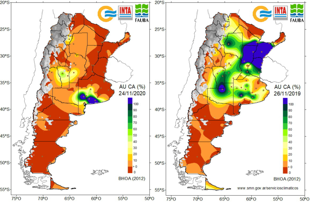 Available Water Content in Argentina as of November 24th, 2020 vs situation as of November 26th, 2019