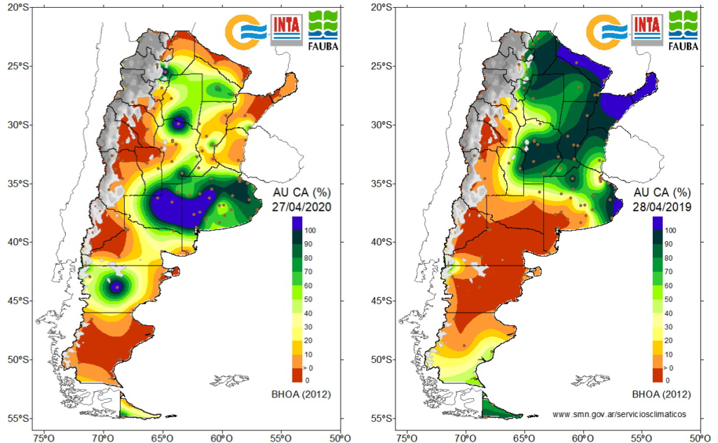 Available Water Content in Argentina as of April 27th, 2020 vs situation as of April 28th, 2019